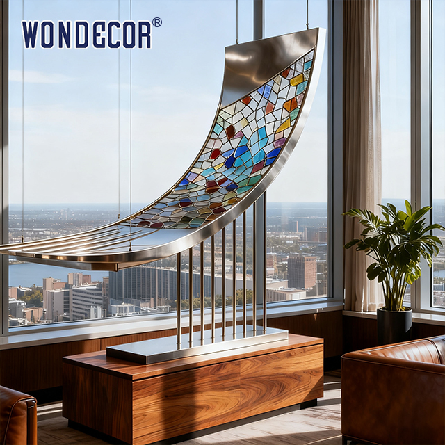 - Expresividad artística única:La fría textura del acero inoxidable combinada con la colorida luz y sombra del vidrio pintado crea un contraste visual llamativo.o grandes formas, mientras que la transmitancia de luz de los vitrales proyecta efectos de luz y sombra soñadores y en capas en las habitaciones de invitados con iluminación natural o artificial.Esto transforma los espacios de vida ordinarios en lugares de experiencia artística que combinan funcionalidad con estética..